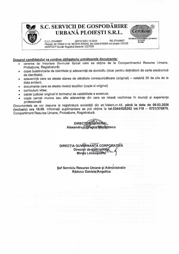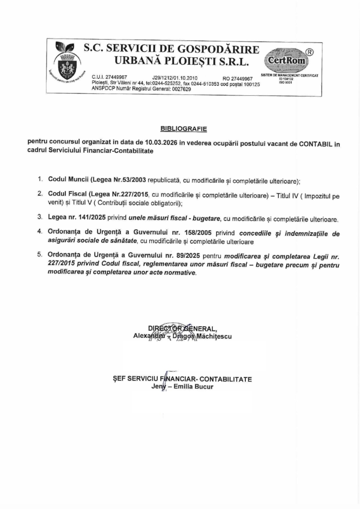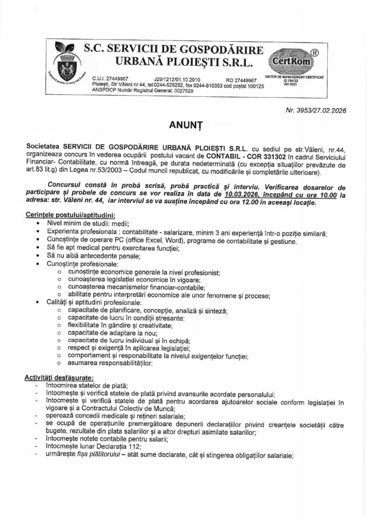 SC SERVICII DE GOSPODĂRIRE URBANĂ PLOIEȘTI S.R.L. organizează concurs în vederea ocupării unui post vacant de contabil din cadrul Serviciului Financiar Contabilitate cu norma intreaga , organizat in data de 10 martie 2026